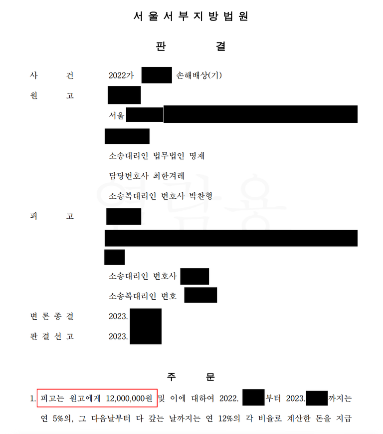 남편들의 상간소송과 똑같은 위자료 1,200만 원이 나옵니다.