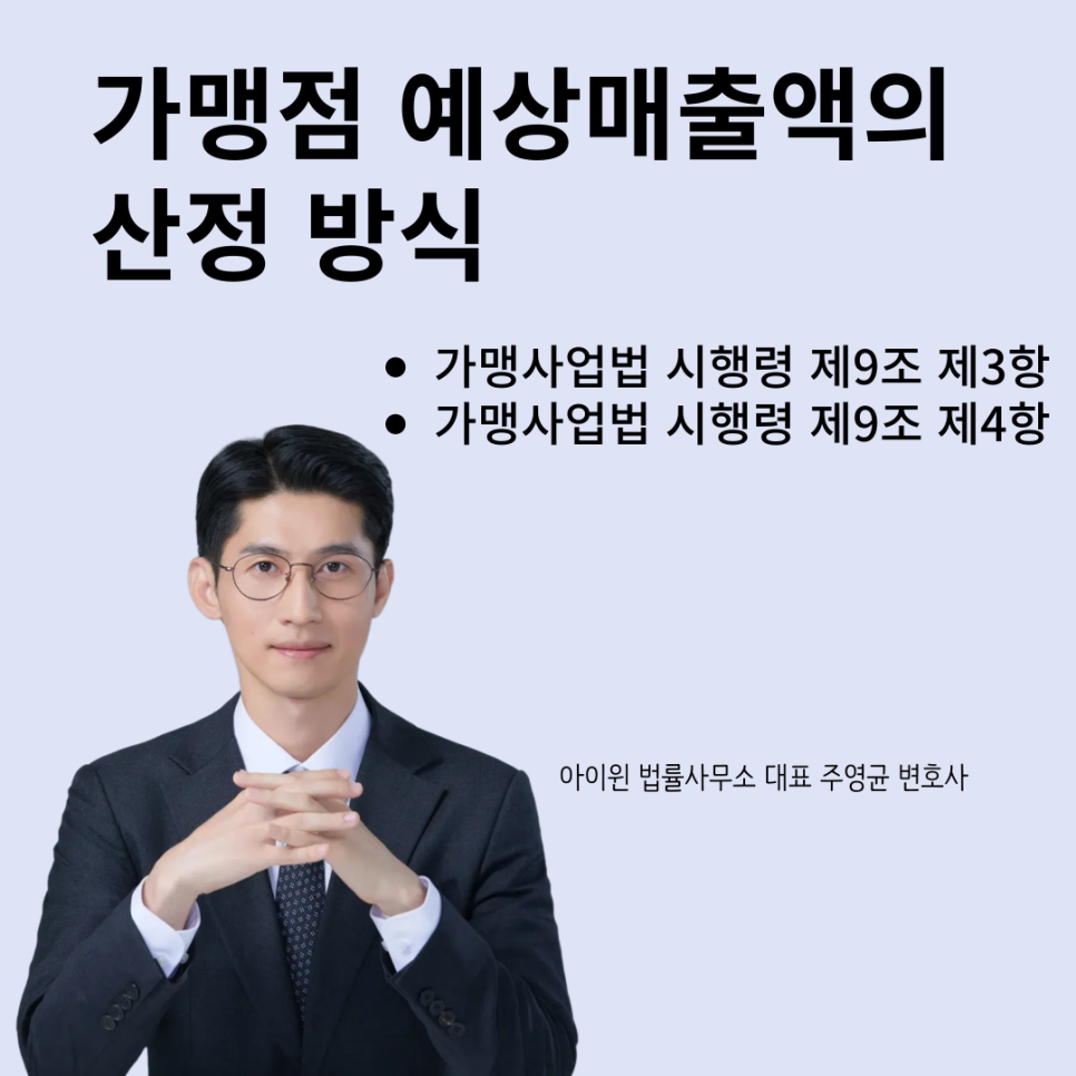 시행령 제9조 제4항은 매우 구체적인 예상매출액 산정 방식이므로, 법 요건에 정확히 맞게 예상매출액이 산정되었는지 확인하면 됩니다. 예컨대 비교가맹점 개수가 정확한지, 비교가맹점이 모두 같은 시도 내에 있는 것인지, 비교가맹점이 모두 직전 사업연도에 6개월 이상 영업한 가맹점인지, 매출환산액 계산에 사용된 매장면적이나 영업일수가 정확한지 등을 확인하시면 되겠습니다.