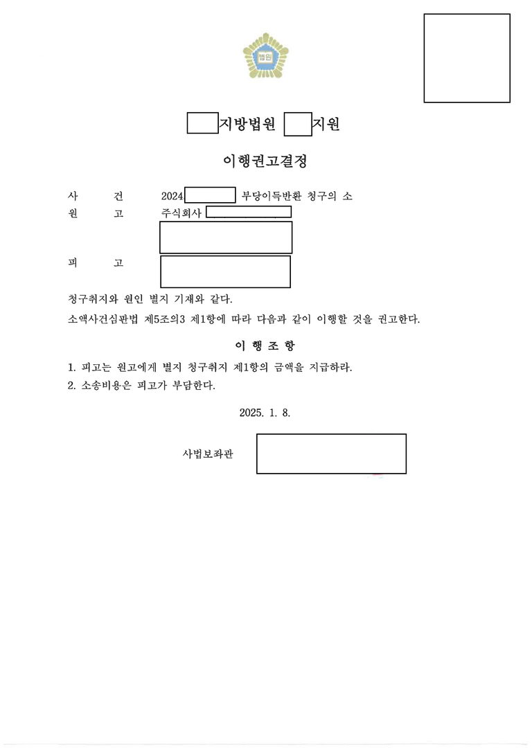 행사용 제품 제작 및 구매를 의뢰하여 계약 체결 후 선금까지 지급하였으나, 상대방업체 측의 채무불이행(샘플과 다른 제품 제공 등)으로 계약 해제 후 지급한 대금의 반환을 청구하여 전부 승소(확정)한 사례입니다.