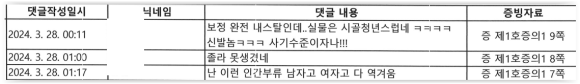 피의자를 특정하기 위해 악성댓글이 게시된 사이트에서 게시글과 댓글을 일일이 캡쳐하였고, 범죄일람표를 만들어 고소장을 제출하였습니다. 게시글이 삭제되기 전 피의자가 특정되어야 하므로 수사관에게 신속한 IP 추적 등 조사 진행을 요청하였습니다.