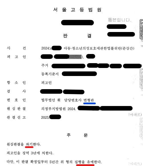 결과는 집행유예의 판결이었습니다. 사안의 중대함이 있어 끝까지 긴장을 늦출 수 없었던 사건이었는데, 항소심에서의 판결로 석방될 수 있어서 안도할 수 있었습니다.