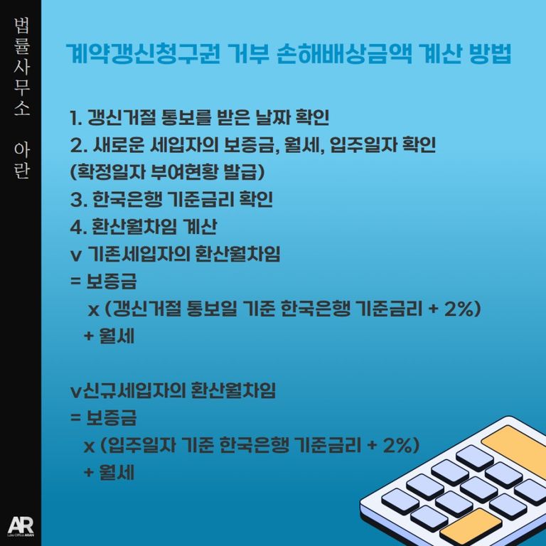 * 계산이 너무 복잡하고 어려우신 경우, 갱신거절 통보를 받은 날짜와 새로운 임차인의 입주일자, 보증금과 월세를 확인하신 다음 저희 사무소로 전화주시면 직접 계산해드립니다.