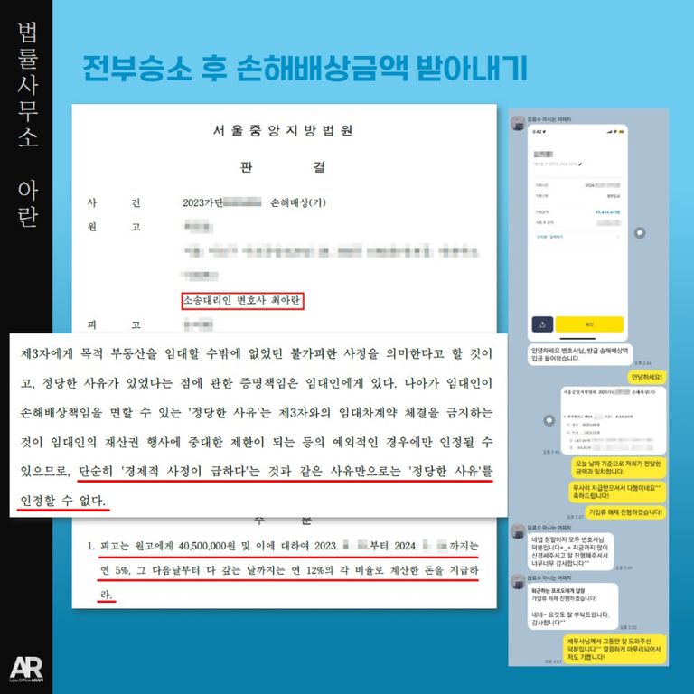 이에 법률사무소 아란을 찾아 집주인에 대한 손해배상청구 소송을 맡겨 주셨습니다.