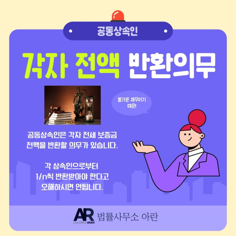 따라서 집주인이 사망한 경우, 세입자는 자신이 아는 상속인 1명만 콕 찍어 '전보증금 전액을 반환하세요'라고 요구할 수 있고, 이때 상속인은 '내 상속지분이 1/n이니 그만큼만 반환하겠다'라고 할 수 없습니다.