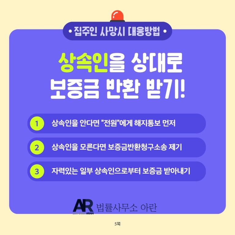 결과적으로 상속인에게 보증금 전액을 받아낼 수야 있겠으나, 애당초 집주인이 사망하지 않았더라면 겪지 않았어도 될 경험을 하고, 소송 과정에서 큰 스트레스를 받기 때문에 임대차기간 중 사망할 가능성이 높은 집주인과는 처음부터 계약을 체결하지 않는 것이 최선입니다.