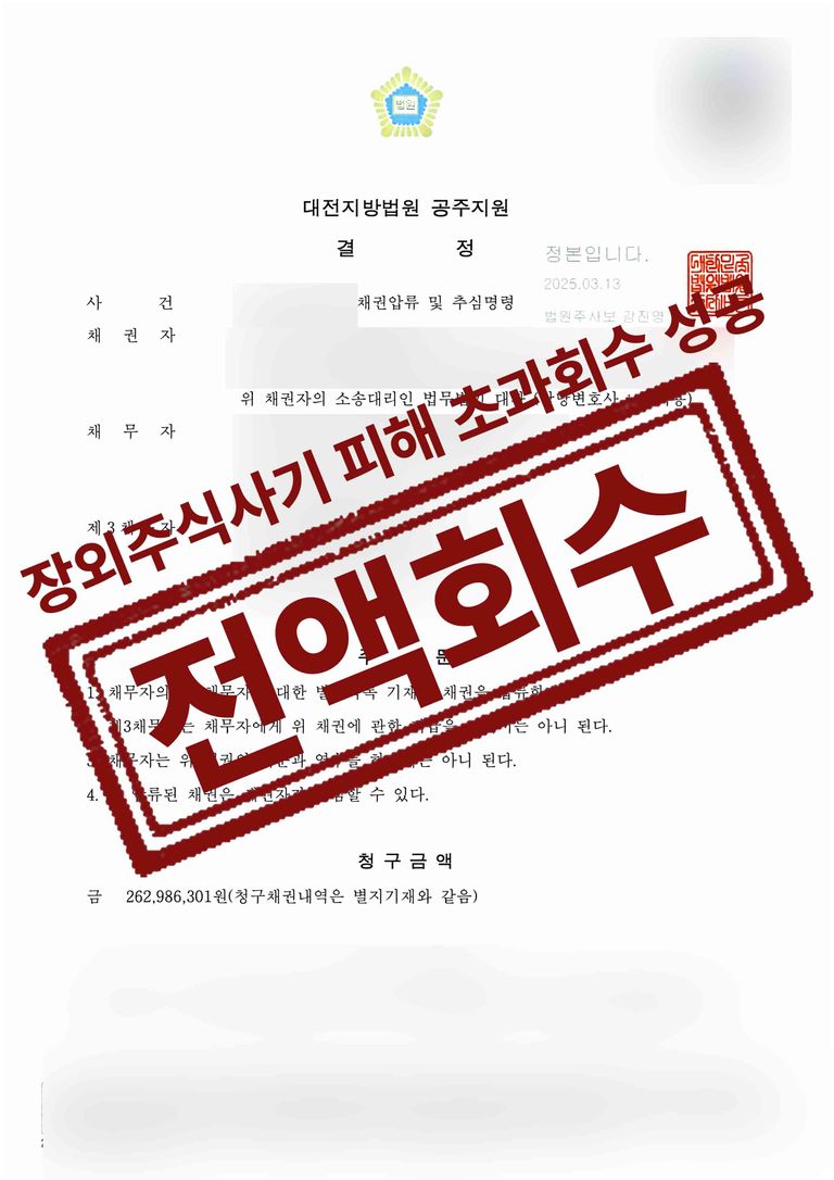 법무법인 대환에서는 장외주식사기에 대한 형사고소를 진행하였고, 계좌가 동결되어 민사소송 대응에 추가 선임을 하셨습니다. 그렇게 원금인 2억 5천만 원에 지연금까지 포함하여 2억 6천만 원 이상 회수할 수 있었습니다.