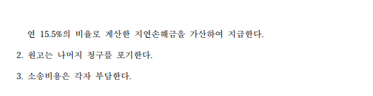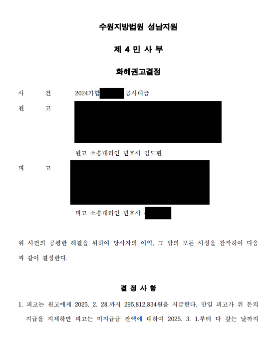 조속한 지급을 목표로 한 협상하여 화해권고결정에 이의제기하지 않기로 합의하고 화해권고결정에서 정한 날짜 이전에 전액 지급하기로 소외 약정하였습니다. 청구금액 전액 수령 등 실질적 이익을 확보하고, 당사자가 정해진 날짜에 전액을 수령할 수 있도록 조율하였습니다.
