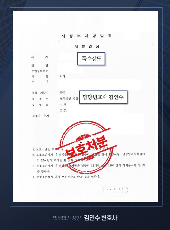 특수강도죄는 무기 또는 5년 이상의 징역형이 선고될 수 있는 중대한 범죄였으나, 이 사건을 맡은 김연수 변호사가 초기 대응부터 법정 변론까지 철저한 전략을 펼쳐 결과적으로 보호처분 1호, 2호, 3호, 4호를 받는 데 성공했습니다.