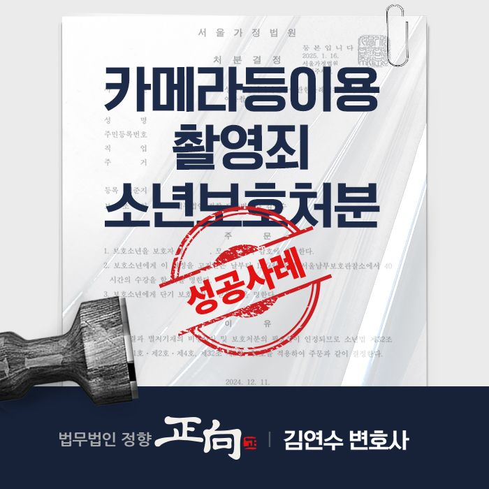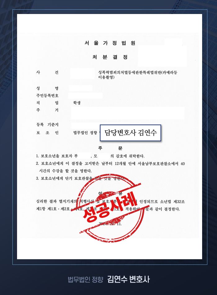 💡 이 사건은 본래 성적목적다중이용장소 침입이나 여죄의 문제가 있어 형사재판으로 이어질 가능성이 컸으나 김연수 변호사의 치밀한 변론 덕분에 보호소년이 형사처벌을 피하고 보호처분을 받을 수 있었던 대표적인 성공 사례입니다.