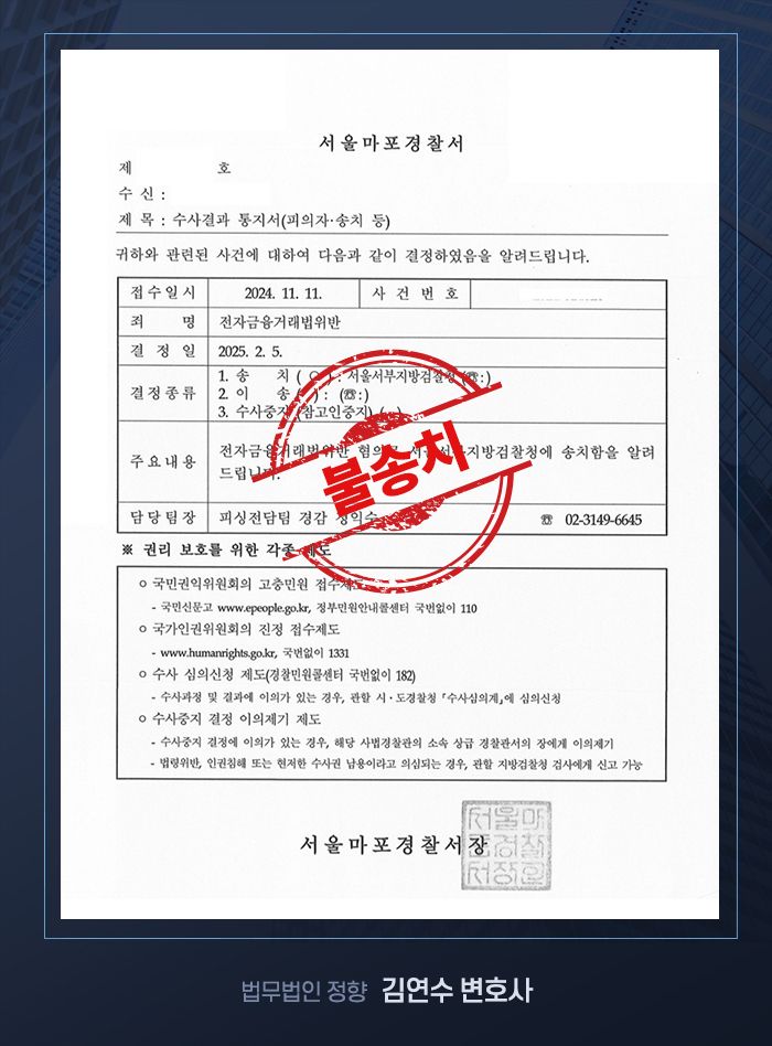 다만, 전자금융거래법 위반 혐의는 인정되어 해당 부분은 송치되었지만, 주요 혐의였던 사기 방조 혐의에서 벗어나게 되면서 의뢰인은 중대한 형사처벌의 위기에서 벗어날 수 있었습니다.