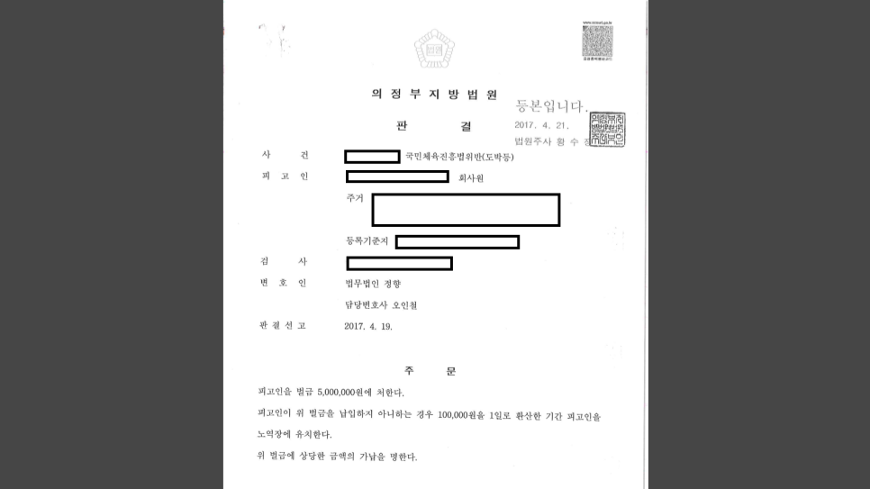 사건 처리결과 오인철 변호사가 기소 이후 재판 단계부터 피고인에 관한 변호를 맡은 사안으로,000님은 결국 도박으로 인하여 취득한 금전적 이득이 존재하지 아니한다는 점 및 스포츠토토 도박은 해외에서 상당히 넓은 범위로 허용되고 있다는 점을 토대로 그 위법성이 그다지 높지 않다는 주장을 하며, 해외 합법 스포츠토토 도박의 사례들을 증거자료로 제출하는 등 적극적으로 방어하여 벌금 500만원의 형이 선고되는 결과를 이끌어 내었습니다.