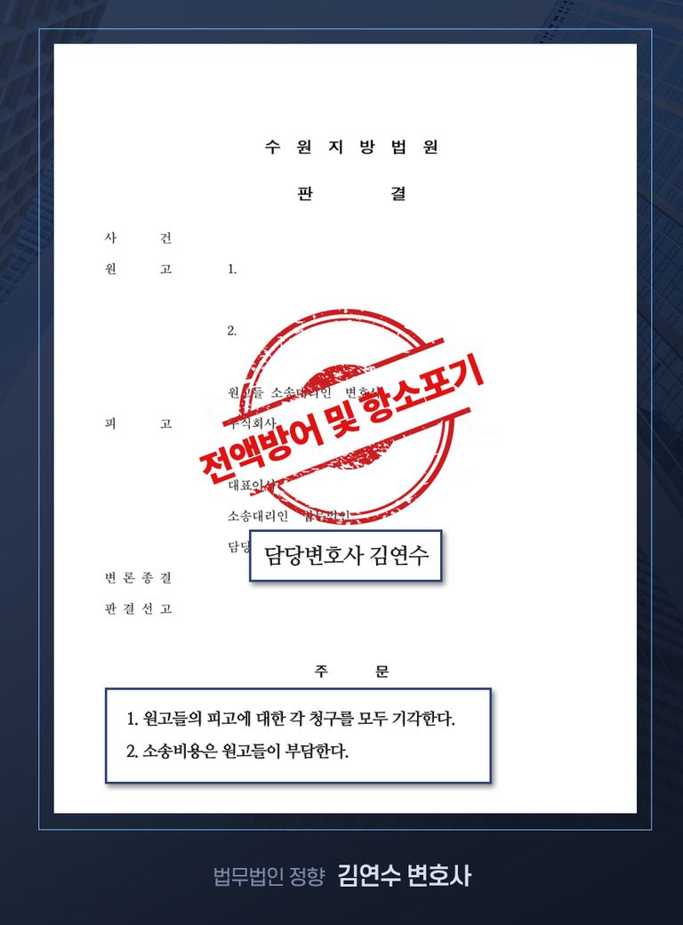 김연수 변호사는 철저한 증거 분석과 법리적 접근을 통해, 피고가 불리한 상황에서도 청구 금액 전액 방어에 성공하였고, 원고들이 항소를 포기하도록 만들어 소송을 조기에 종결시켰습니다.