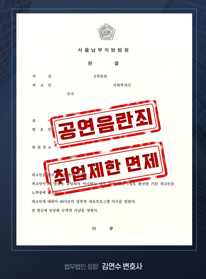 강남역변호사가 실제로 수행했던 공연음란죄 취업제한 면제 사례와 함께 설명해 드릴 테니,