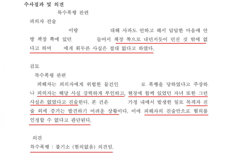조사를 마친 뒤, 저는 자녀들의 진술서, B씨가 이혼 소송에서 제출한 서류 등 여러 객관적인 자료를 바탕으로, A씨는 이 사건 당시 답답한 마음에 B씨가 서 있던 반대편에 있던 책장에 책을 던졌을 뿐이며, 당시 이 상황을 목격한 자녀들이 역시 동일하게 진술하고 있다는 점, B씨는 이혼 소송에서 A씨의 귀책사유 등을 만들기 위해서 말다툼을 하였던 것에 대해서 형사고소를 하며 "A씨로부터 팔, 다리 등을 폭행 당했다", "A씨로부터 책으로 맞았다" 등 허위의 사실을 신고한 것으로 보인다는 점 등을 적극적으로 어필하며 "A씨는 이 사건 당시 B씨를 폭행하거나 특수폭행한 사실이 전혀 없다"는 점에 대해서 법률적인 관점에서 합리적으로 주장하는 내용의 변호인의견서를 제출하였습니다.