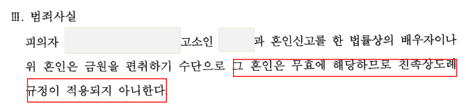 경찰은 아래 송치 범죄사실과 같이 피의자가 금원을 편취하기 위한 수단으로 혼인하였으므로 혼인은 무효에 해당되어 친족상도례가 적용되지 않고, 그 혐의가 인정된다는 이유로 본건을 의정부지방검찰청에 송치하였습니다.