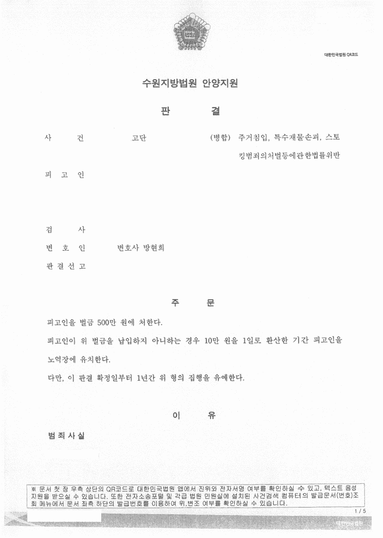 제가 담당하였던 사건 중에 피고인이 스토킹범죄의처벌등에관한법률위반, 주거침입, 특수재물손괴로 기소되어 형사 재판을 받게 되었으나, 법원에서 벌금형의 집행유예를 선고받은 성공사례를 소개해 드리겠습니다.
