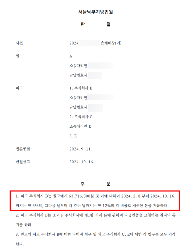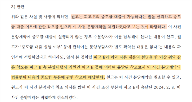 이에 서울남부지방법원은 원고가 중도금 대출 여부에 관한 착오로 이 사건 분양계약을 체결하였으므로, 이 사건의 분양계약은 적법하게 취소되었으며, 피고로 하여금 원고에게 계약금 전액을 반환하라는 원고 승소판결을 선고하였습니다.