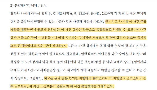 그런데 완공 후 확인을 해보니 해당 상가에 병원으로 분양된 곳이 하나도 없다는 것을 알게되어, 이 사건 상가의 독점 약국 임대 및 병원 분양 등애에 대해 묵시적인 합의가 있었음에도 피고가 이를 이행하지 못하였으므로 분양계약을 취소해야 한다는 내용의 민사소송을 제기하였습니다.