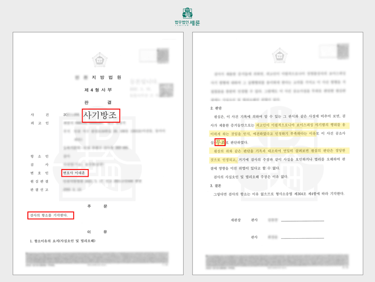 만약 사기방조의 혐의가 인정될 경우 5년 이하의 징역 또는 1천만 원이하의 벌금의 처벌을 받게되는데요, 다행히 의뢰인 A씨는 저희 형사전문로펌 세륜의 조력으로 무죄 판결을 받았습니다.