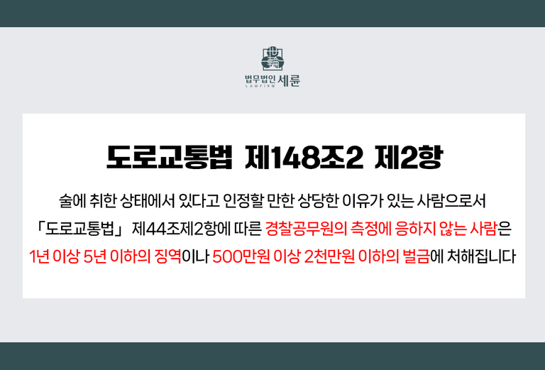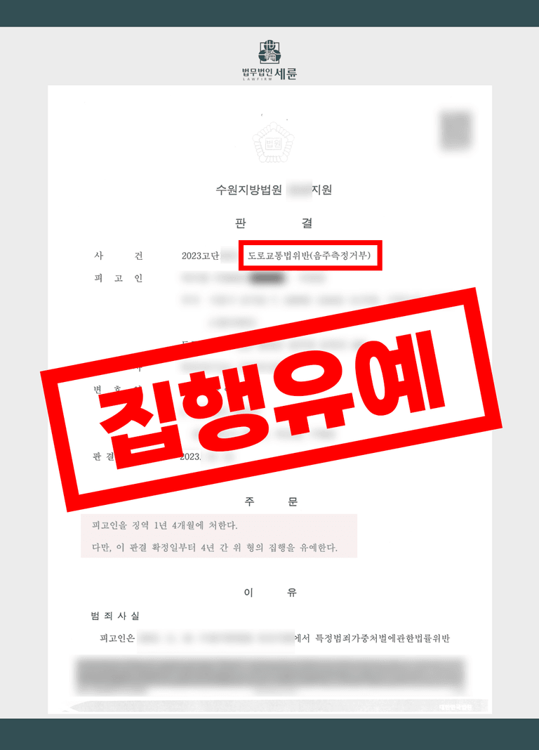 📢 우수 검사 출신 변호사 / 10년 경력 형사전문변호사 [법무법인 세륜]의 실제 사례를 바탕으로 각색한 성공 사례입니다. 음주운전 4회 전력이 있던 의뢰인은 음주운전 5회째 "음주측정거부"로 적발되어 저희 법무법인을 찾아주셨고, 집행유예를 받아낸 실제 사례를 소개합니다.
