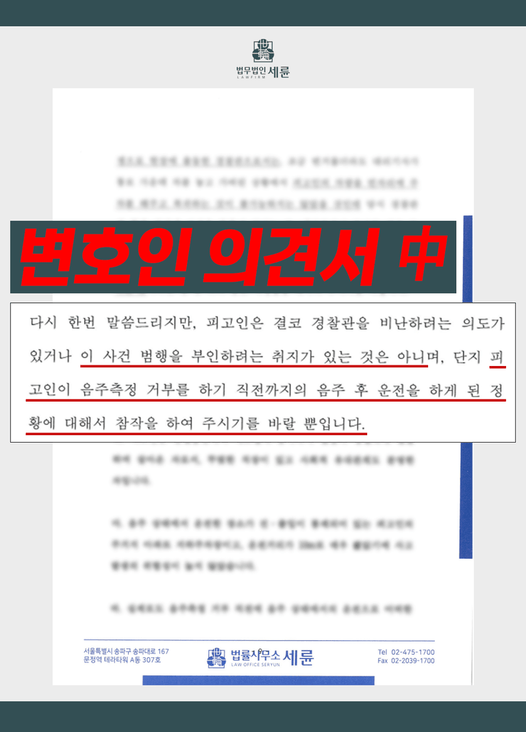 특히 이 사건의 경우 동종 전력이 이미 4회가 있었던데다가, 음주측정 거부까지 한 상황이라 의뢰인은 절대적으로 불리할 수 밖에 없는 상황이었습니다.