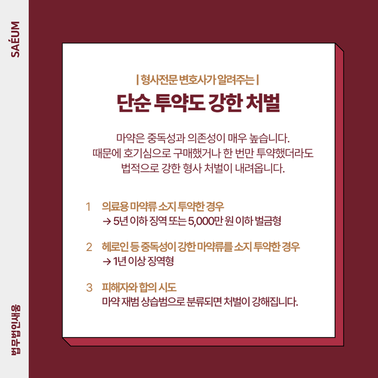 마약은 신체와 정신에 심각한 영향을 미치며, 환각·환청 증상뿐만 아니라 중독성과 의존성이 매우 높습니다. 이러한 특성 때문에 한 번 손을 대면 쉽게 벗어나기 어려운데요. 단순한 호기심으로 구매했거나 한두 번 투약한 경우라도 법적으로 강한 처벌이 내려집니다.