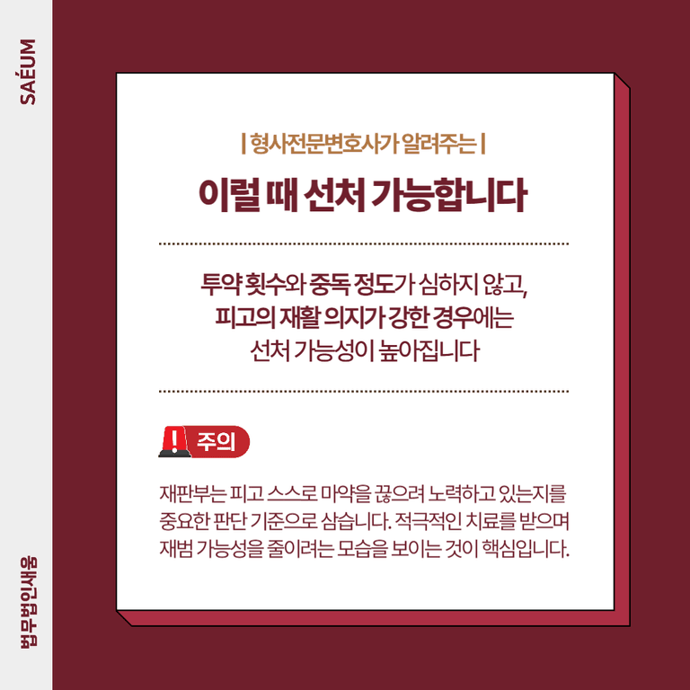 재판부는 피고인이 스스로 마약을 끊으려 노력하고 있는지를 중요한 판단 기준으로 삼습니다. 마약 중독은 혼자의 힘으로 극복하기 어려운 만큼, 적극적인 치료를 받으며 재범 가능성을 줄이려는 모습을 보이는 것이 핵심입니다.
