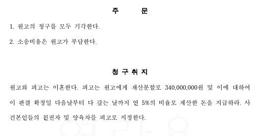 이혼 및 재산분할로 3억 4,000만 원을 청구받은 피고를 대리하여, 민법 제840조 각호에 따른 이혼사유가 없음을 주장하여 원고 청구 기각을 구해 전부 승소