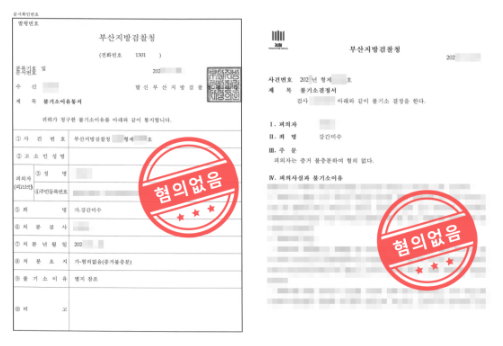 : 이와 같이 수행한 결과 검찰의 "무혐의(증거불충분)" 불기소 처분을 통해 수사가 종료되었고, 의뢰인은 재판을 받지 않고도 일상으로 돌아갈 수 있게 되었습니다.