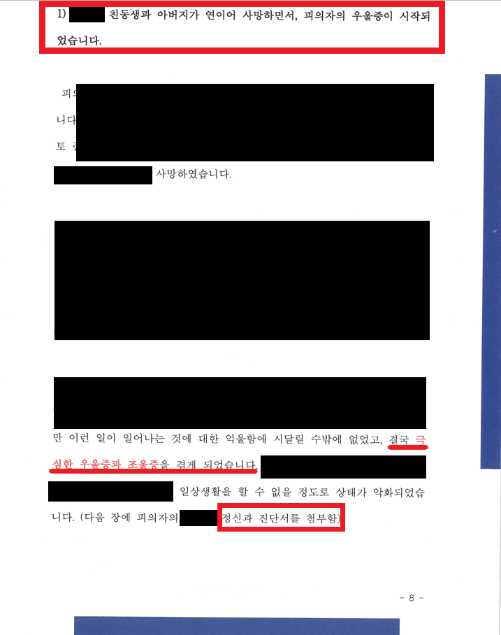 - 사건 당시에도 우울증에 시달리던 중 충동적으로 범행에 이르렀음