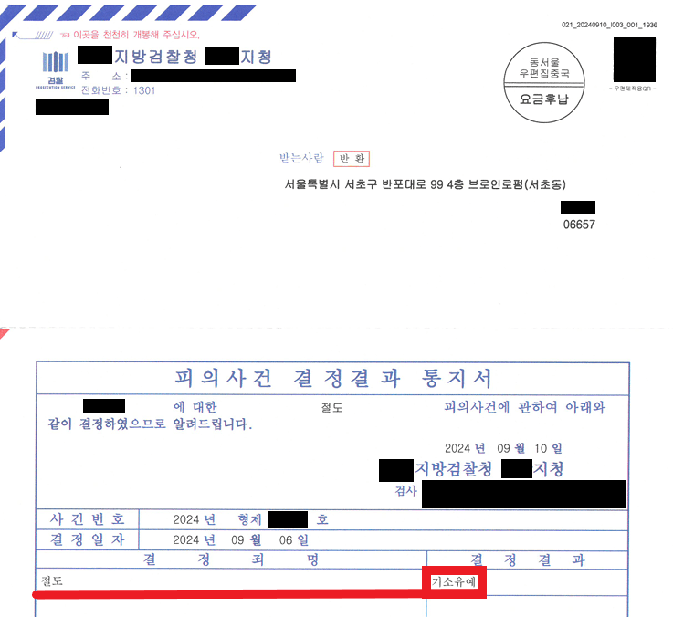 다행히도 담당 검사는 의견서 내용을 고려하여 A에게 '기소유예' 처분을 하였습니다. 그리고 기소유예 통지서도 제 사무실 한 곳으로 도달되었습니다.
