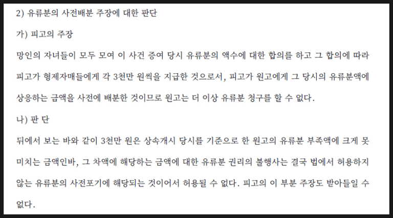 ③ 실질적 형평 도모: 법원은 형식적인 합의 내용보다는 상속인 간의 실질적인 형평을 도모하고자 노력했으며, 이미 지급된 금원을 유류분 부족액에서 공제함으로써 공정한 결과를 도출하고자 했습니다.