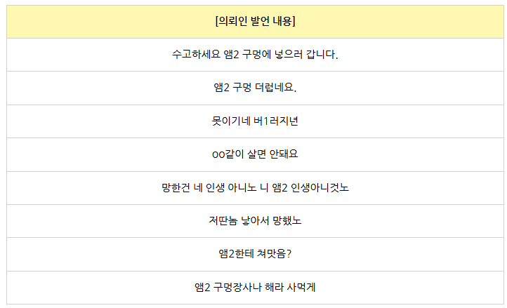 게임을 하던 중 고소인은 의뢰인을 깎아내리는 말을 했고 이에 화가 나 “앰2 구멍 장사나 해라 사먹게, 앰2 구멍에 넣으러 갑니다.”와 같은 발언을 수차례 전송했다 하였습니다.