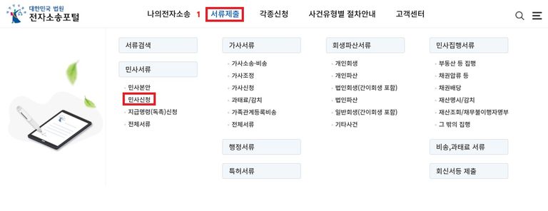 1. 서류제출을 클릭하신 후 왼쪽에 민사신청을 클릭하십니다.
