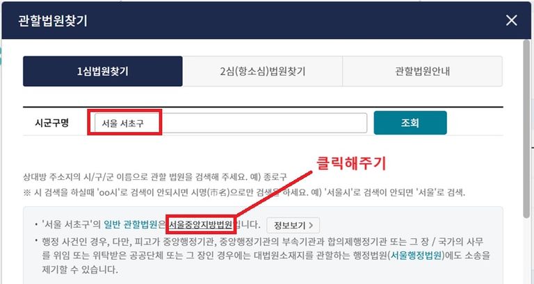 그럼 아래 관할법원으로 "서울중앙지방법원"이 뜨지요?