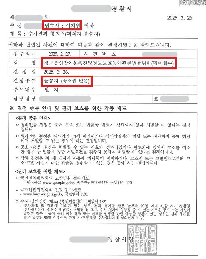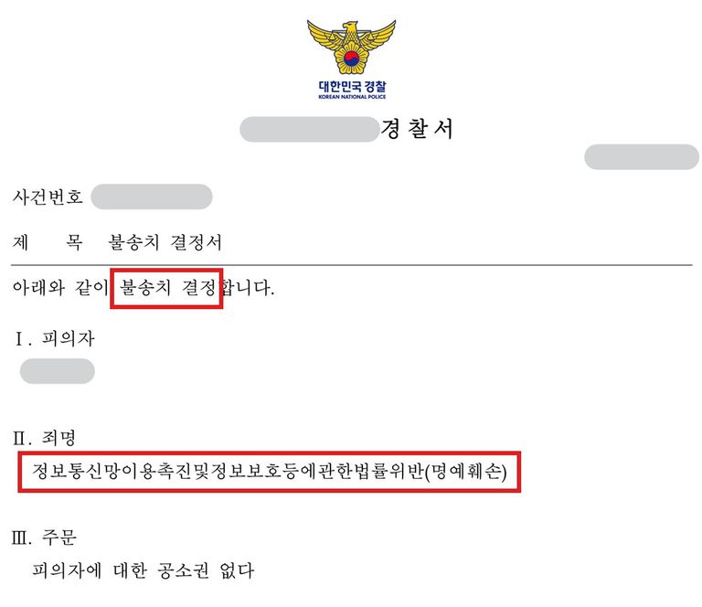 피의자에 대한 사이버 명예훼손 혐의의 수사는 '공소권 없음'으로 종결됩니다.