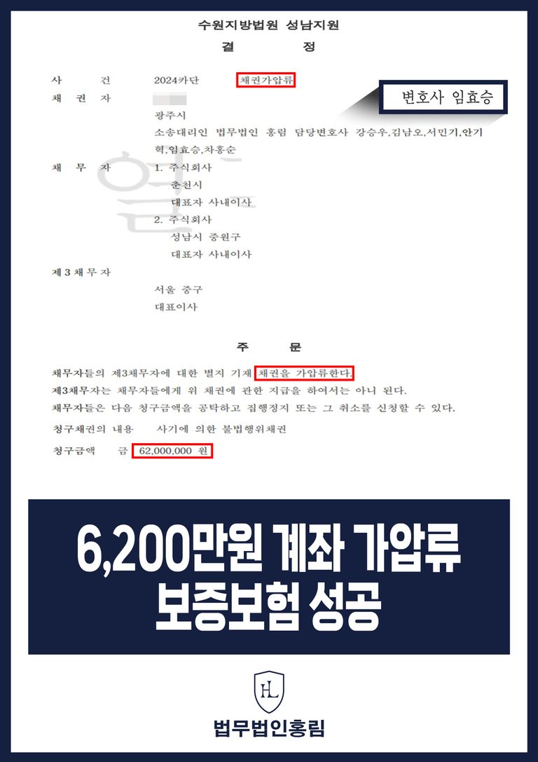 그 결과 법원에서는 본 변호인의 주장을 받아들여 통장 가압류(전액 보증보험)하였습니다.