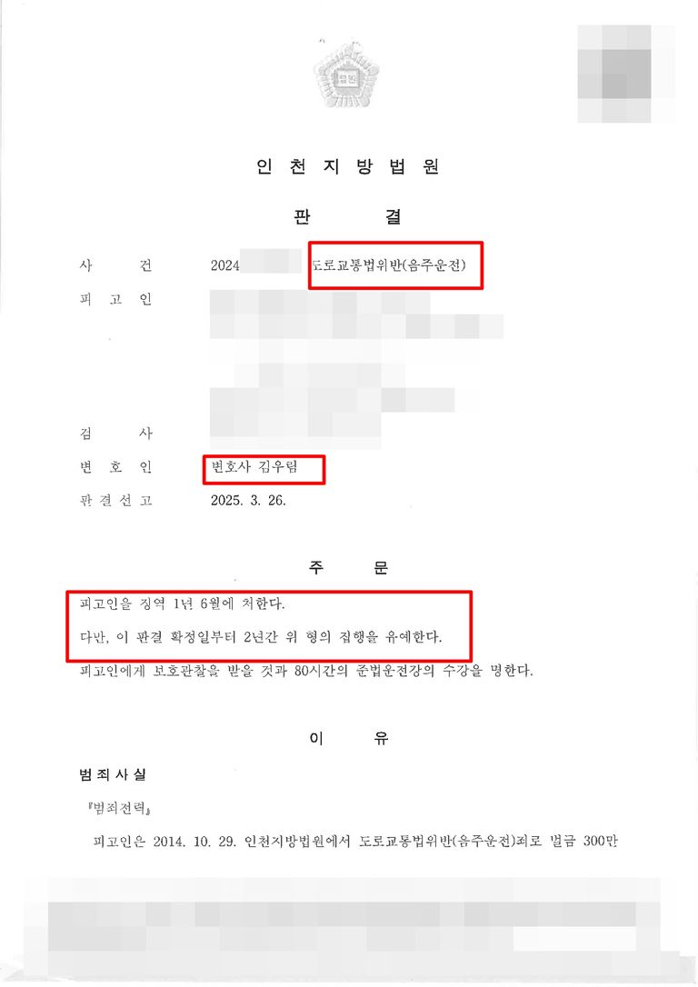 담당변호사는 의뢰인이 이미 동종 전과가 있었고 높은 혈중알코올농도 수치가 나왔기 때문에, 최대한 실형을 피하기 위한 변론 전략을 세우고 의견서를 통해 의뢰인이 처음부터 음주운전을 한 것이 아니라 의뢰인을 태우러 온 여자친구와 싸우고 여자친구가 의뢰인과 차량을 길 한복판에 세워두고 가서 운전하게 된 점, 이미 판결이 확정된 죄와 동시에 판결할 때와의 형평을 고려하여야 한다는 점, 의뢰인에게 있는 다른 유리한 양형사유를 주장하여 재판부에 선처를 구하였습니다.