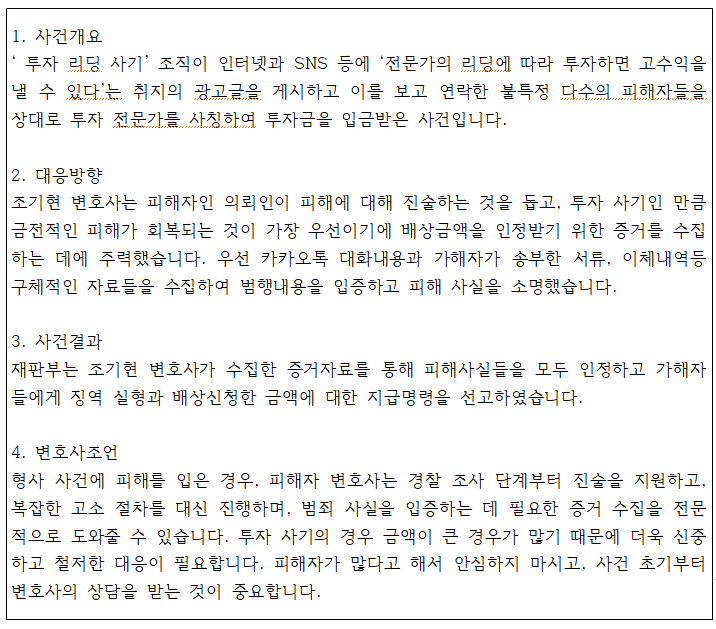 아래는 실제로 투자 리딩 사기 피해자 손해배상명령 성공사례입니다.