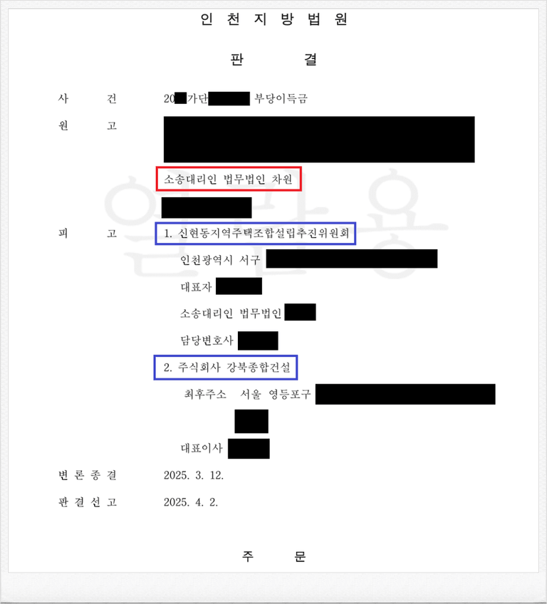 그러나, 가입 후 피고 신현동지역주택조합 설립추진위원회 측의 사업이 계획대로 진행되지 않았고, 이에 의뢰인은 정식 민사소송을 통하여 기 납입한 금원의 반환을 원하였습니다.