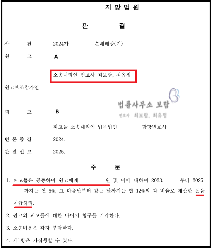 결국 법원은 최보람, 최유정 변호사의 주장을 받아들여, 옆 건물 소유자 B가 의뢰인 A에게 집기, 인테리어 등 손해와 영업손해 등을 전부를 배상해야 한다고 판결했습니다.