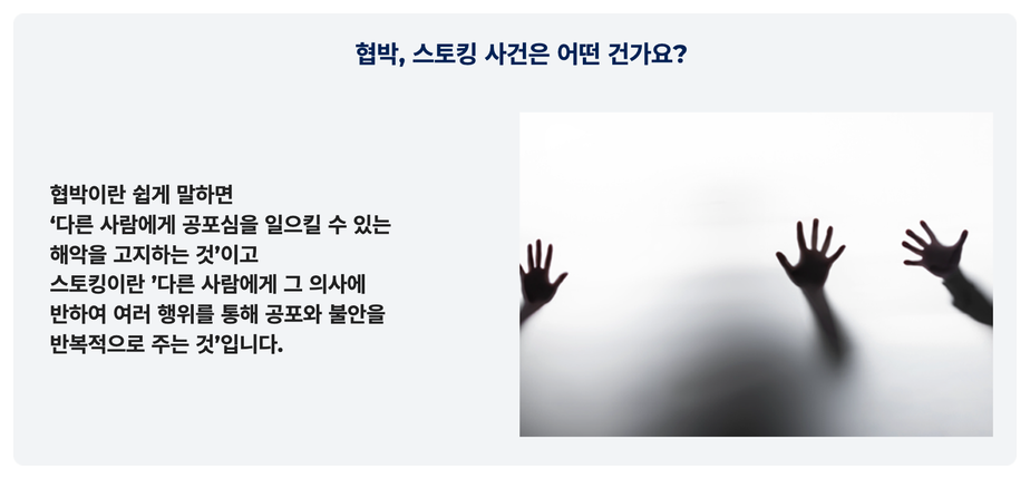 스토킹은 다른 사람에게 그 의사에 반하여 여러 행위를 통해 공포와 불안을 반복적으로 주는 것을 말합니다.