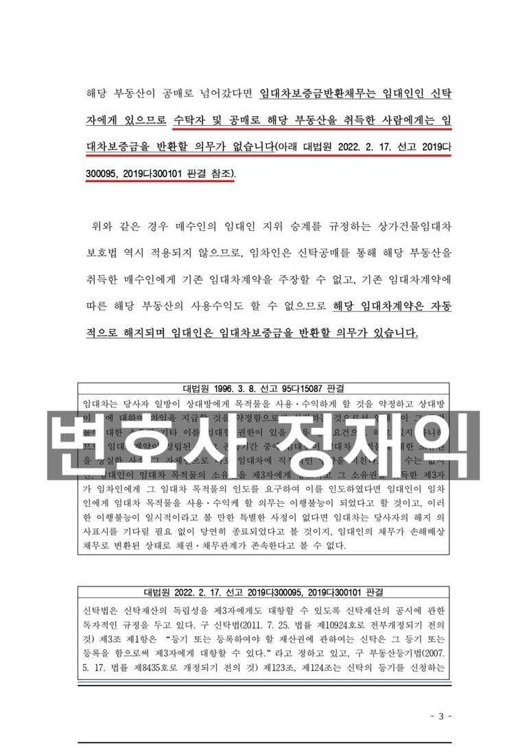 첫째, 일반적인 상가임대차보호법 사례와 달리 신탁공매는 건물주가 바뀌어도 새 건물주가 임대차계약을 승계하지 않습니다. 신탁공매로 취득한 부동산에서 발생한 임대차보증금 반환의무는 신 소유자가 아닌 기존 소유자(신탁자)에게 있다는 것입니다.