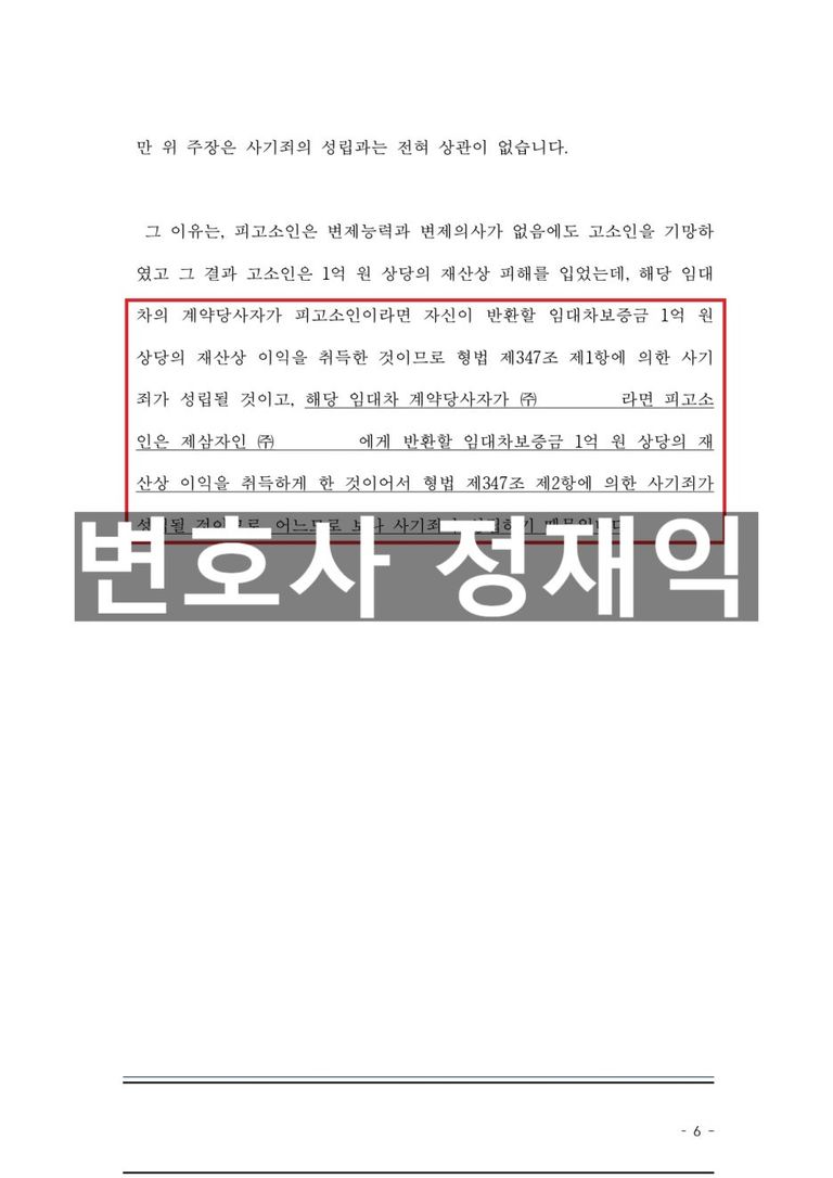 정재익 변호사는 B씨가 임대차 계약상 직접 계약자이든 주식회사 C 명의로 계약을 맺었든, B씨가 개인적 이익을 취득한 점은 형법 제347조 제1항 및 제2항(사기죄의 구성요건)에 따라 명백히 성립한다는 점을 강조했습니다. 즉, 계약의 형식과 무관하게 B씨가 본인의 개인 채무 변제를 위해 A씨를 기망한 행위가 명백한 재산상 이익을 취득한 행위라는 점을 상세히 논증하였습니다.