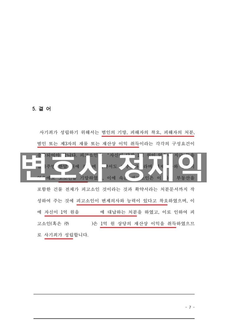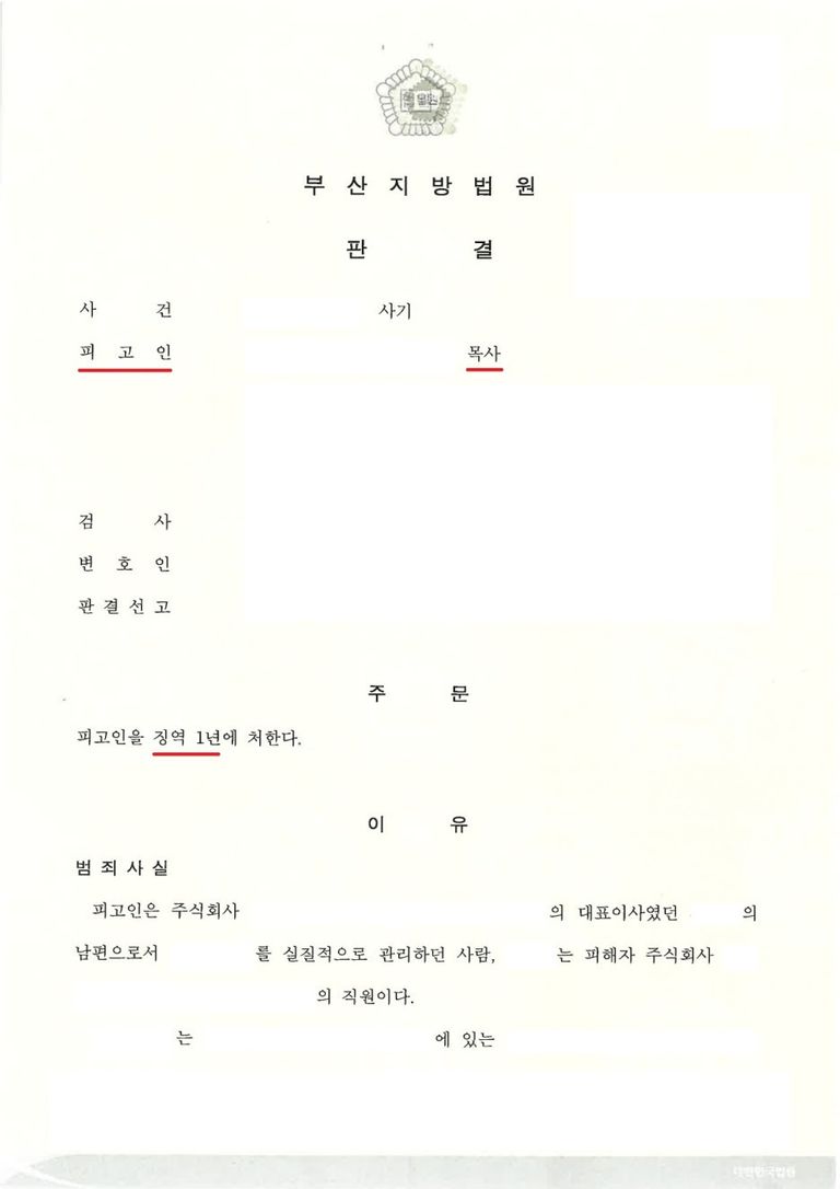 정재익 변호사는 B씨가 제기한 교묘한 변명들을 심도 있는 법리 논증을 통해 모두 반박하고, 담당 수사관과 검사를 설득하여 사기죄로 기소되도록 이끌었고, 이후 진행된 형사 재판에서도 재판부로부터 징역 1년의 실형 선고를 이끌어냈습니다.