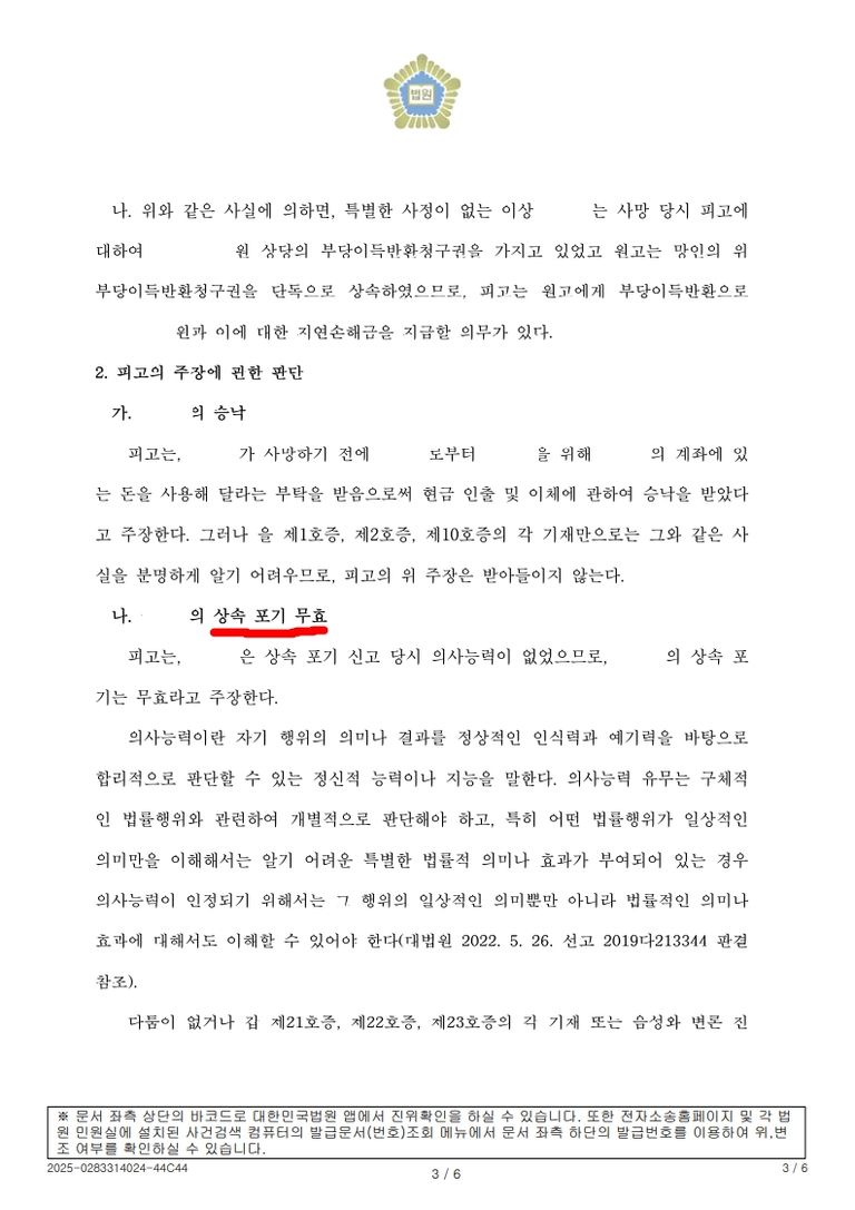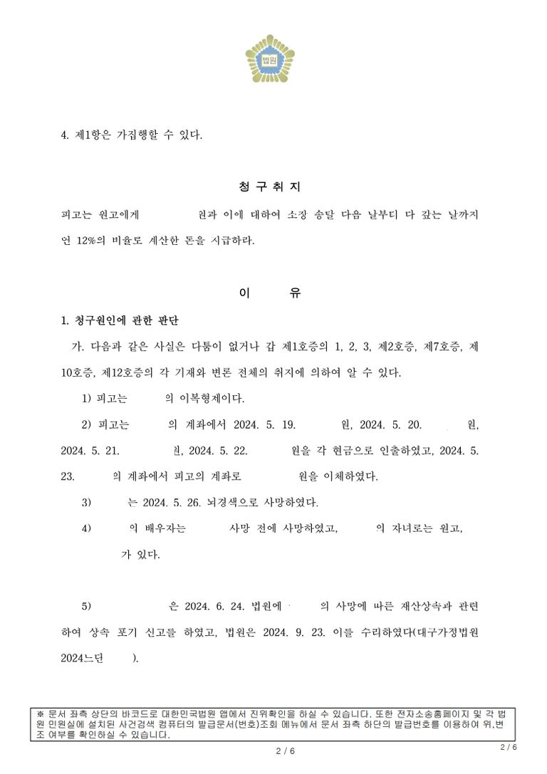 그러나 장례 이후, 연락 한번 없었던 형의 아들(즉, A씨의 조카, 원고)이 갑자기 변호사를 선임하여 삼촌인 A씨에게 소송을 제기했습니다. 원고는 "삼촌이 아버지의 돈을 마음대로 사용했다. 그 돈은 상속인인 내 돈이다."고 주장하며 약 1억 원 이상의 큰 금액을 반환하라고 청구했습니다. 원고는 자신이 사망한 형의 유일한 상속인이므로 삼촌인 A씨가 인출한 모든 금액을 돌려받아야 한다고 주장했습니다.