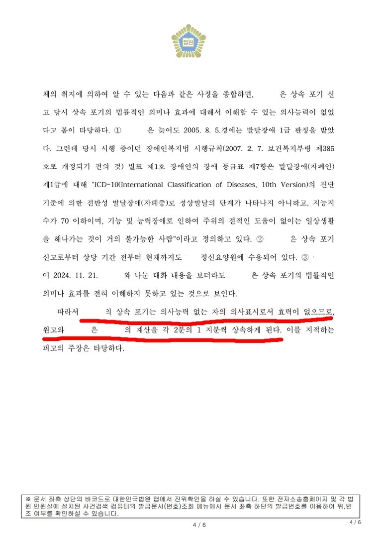 원고의 형제들 중에서는 지적장애가 있는 가족 구성원 B가 있었고, 이 경우 법적으로 상속 포기 효력이 인정되지 않는다는 중요한 점을 부각하여 원고의 "유일한 상속인" 주장을 반박하였습니다. 원고는 법원에서 상속포기를 인정했다며 상속포기 결정문을 제시하였으나, 실제 병원 관계자의 증언과 진료기록 등을 제출하여 B가 상속포기라는 것을 이해하고 서명할만한 정도가 아니라는 것을 증명하였습니다.
