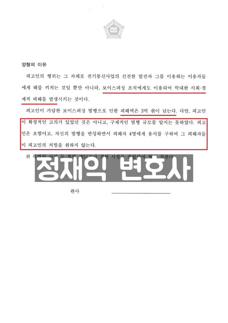 재판부는 보이스피싱 범죄는 막대한 사회·경제적 피해를 발생시킨다는 점, 이 사건의 피해액이 3억원이 넘는다는 점 등을 불리한 사유로 지적했습니다.