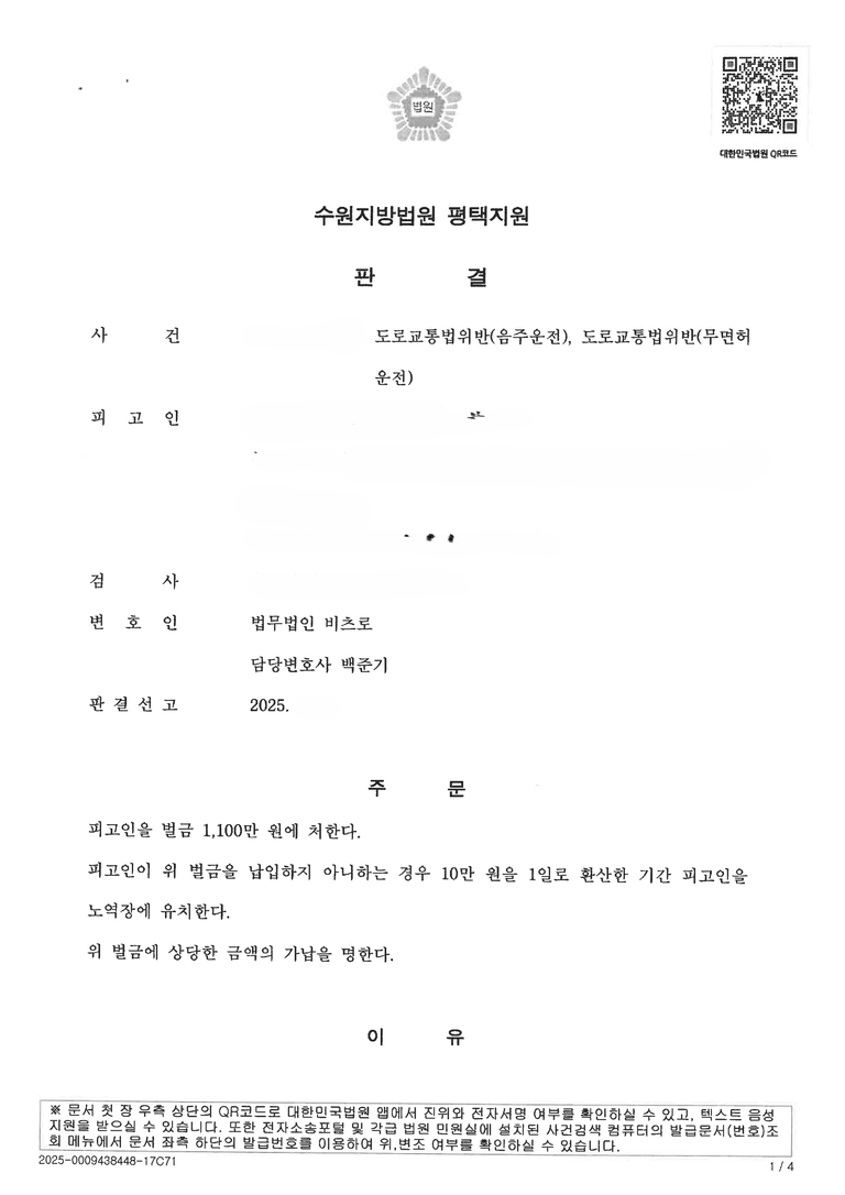그러나 적극적인 양형사유 주장을 통해 벌금 1,100만 원의 판결을 받아 성공적으로 방어하였습니다. 간혹 집행유예가 벌금형보다 낮을 것으로 알고계신 분들이 있는데 참고로 집행유예는 벌금형보다 훨씬 높은 형에 해당합니다.