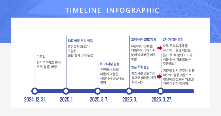 오늘은 이러한 고려아연의 공격에 대해 영풍과 MBK 파트너스가 어떠한 대비책을 세웠는지, 법원에서는 어떠한 항변을 했는지, 그리고 법원은 어떠한 이유로 이러한 영풍과 MBK 파트너스의 항변을 배척했는지 알아보도록 하겠습니다.